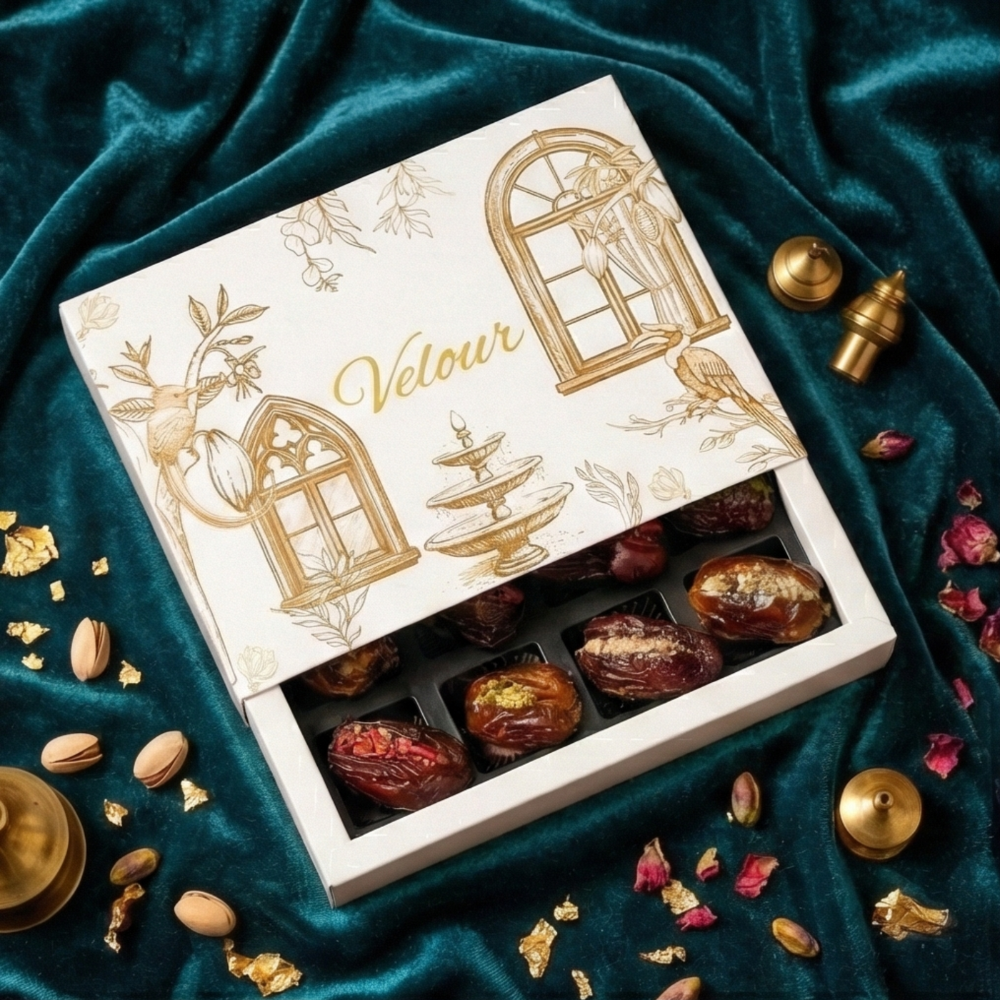 Jewels of Velour is a luxury stuffed dates gift box from India’s bean‑to‑bar craft chocolate makers. It contains 12 premium Medjool dates, each hand‑stuffed with bean‑to‑bar dark chocolate fillings made from Indian cacao, presented in an elegant deluxe box.