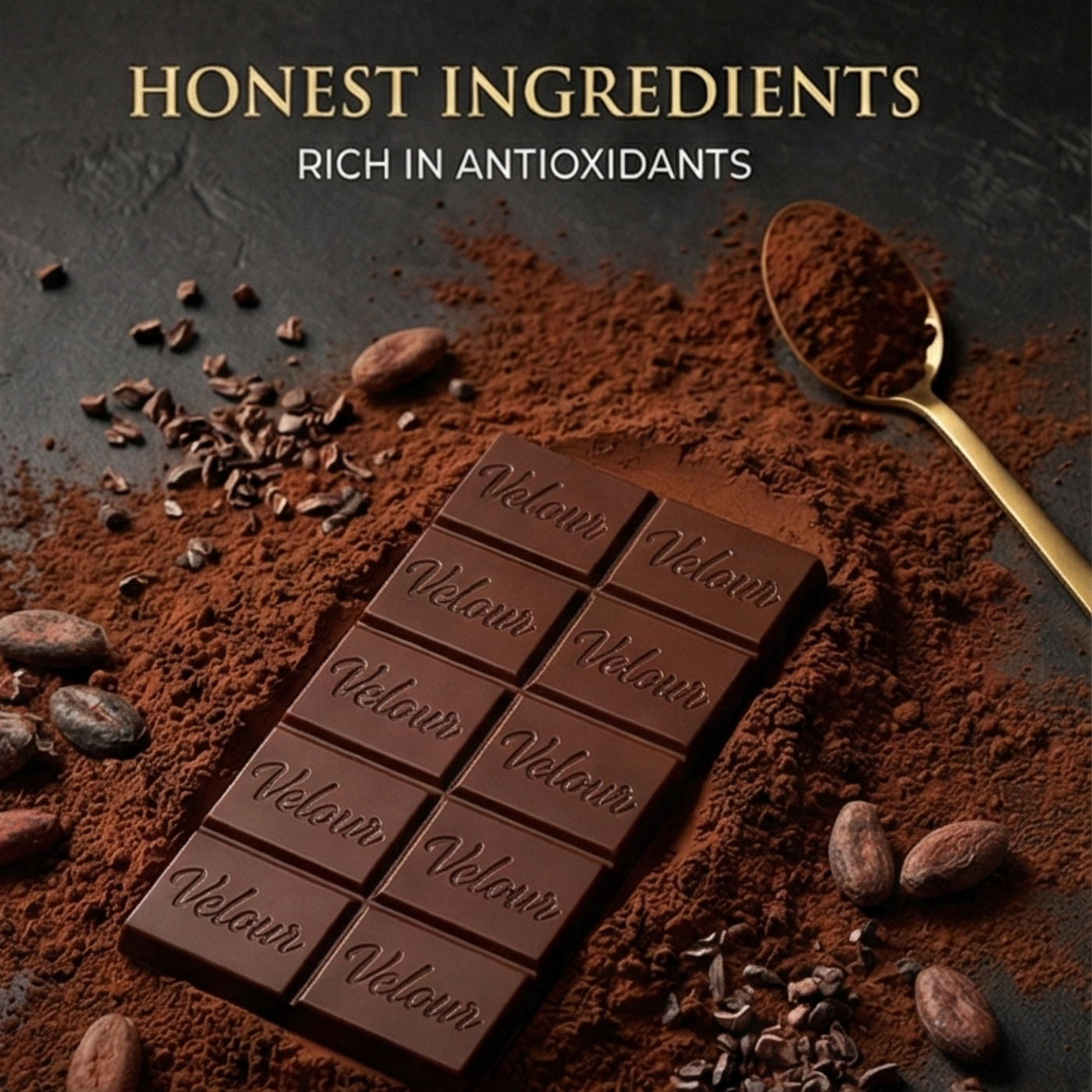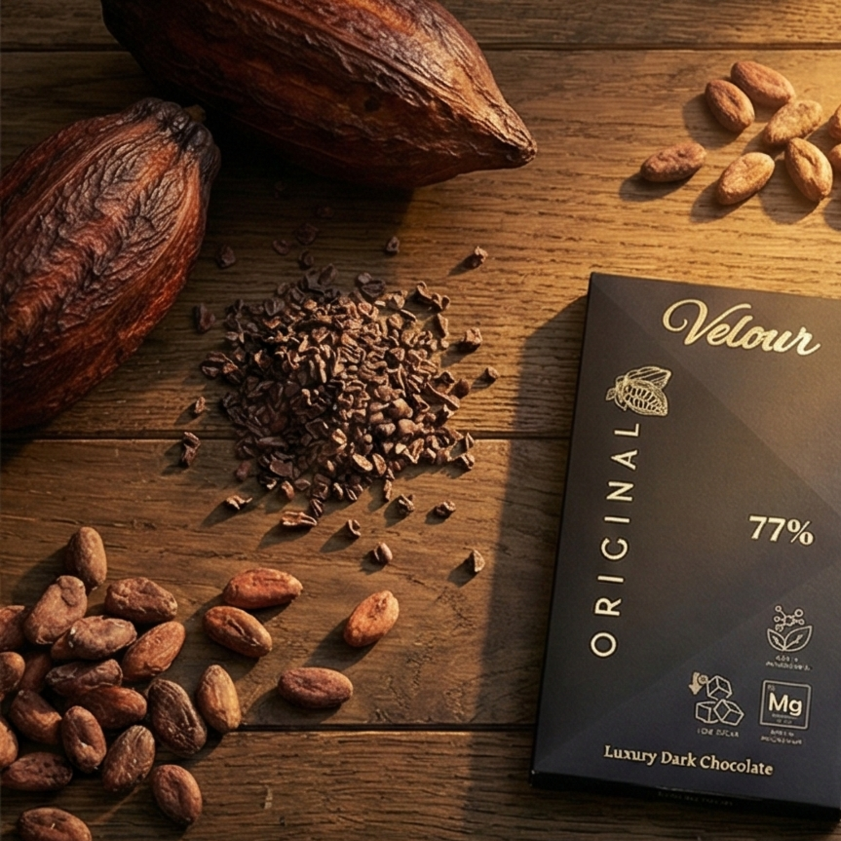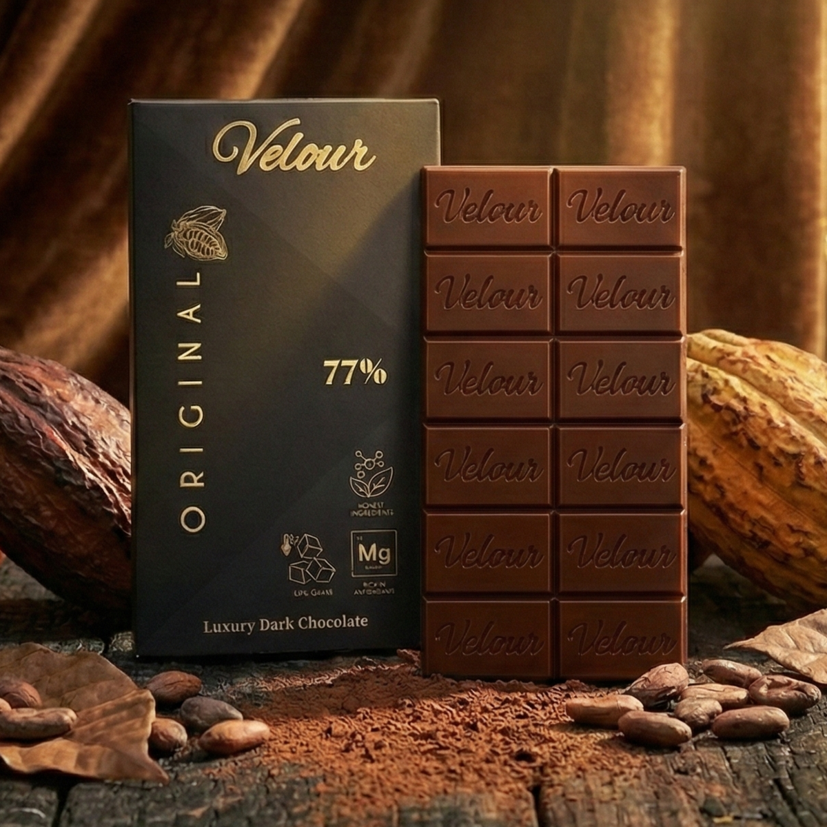 Velour’s signature 77% bar is a premium bean‑to‑bar, vegan dark chocolate from India, balanced for both enthusiasts and newcomers to craft chocolate. Made from single‑origin cacao, stone‑ground for a silky texture and expertly tempered for a clean snap, it delivers deep cocoa flavor without harsh bitterness. No additives or preservatives. Gluten‑free, dairy‑free, plant‑based luxury, ideal for premium gifting, festive or corporate occasions, and everyday indulgence.